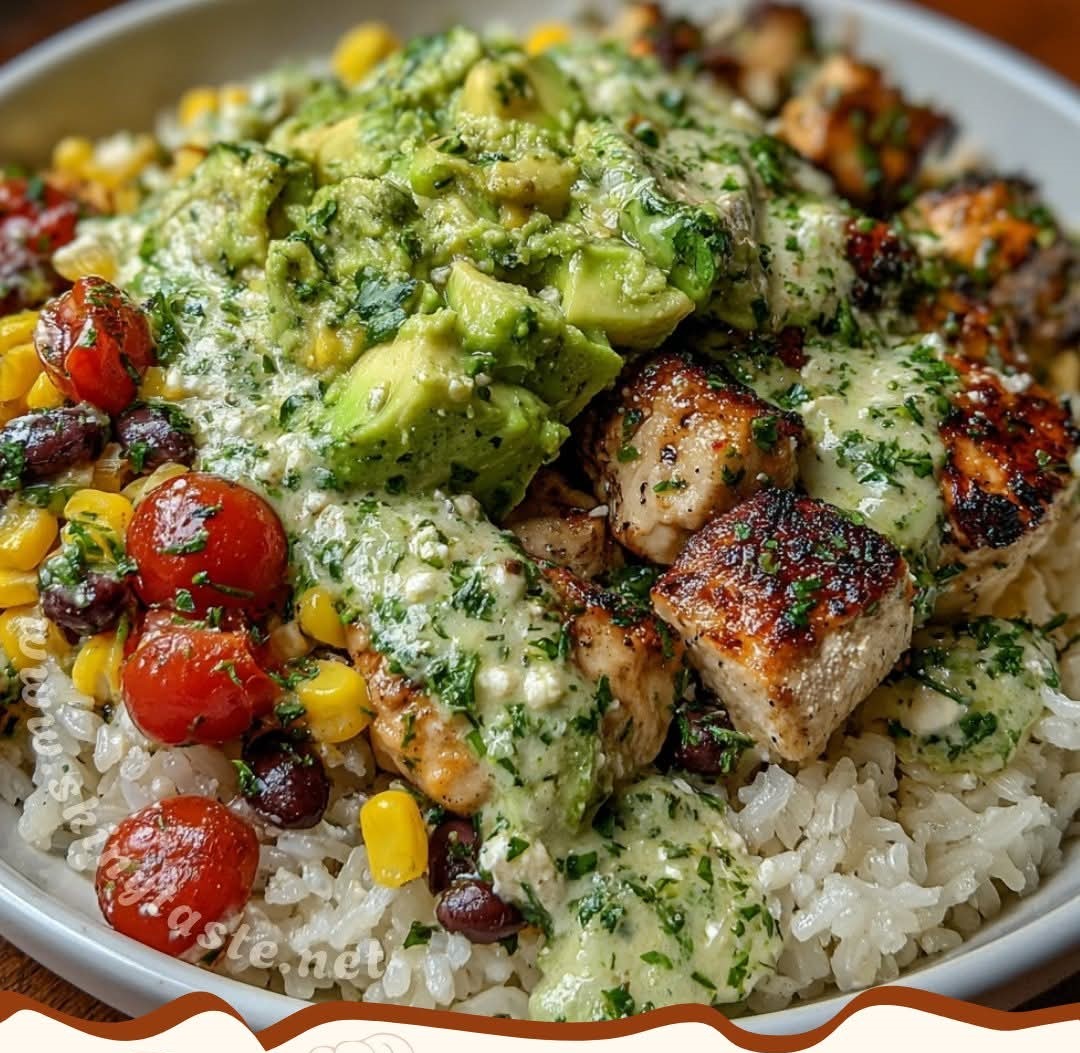 This Mediterranean Cilantro Lime Chicken Burrito Bowl is a perfect blend of bright, creamy, and hearty flavors. The avocado cottage cheese dressing ties everything together — rich yet refreshing — while the chicken, beans, and rice make it a balanced, filling meal.