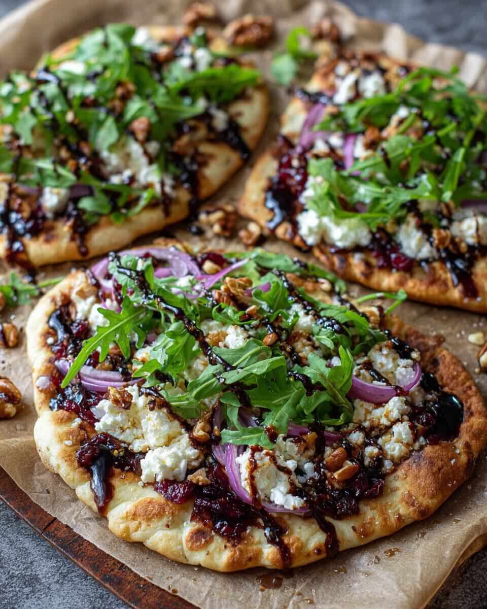 Mediterranean Cranberry Balsamic Flatbread with Goat Cheese & Arugula