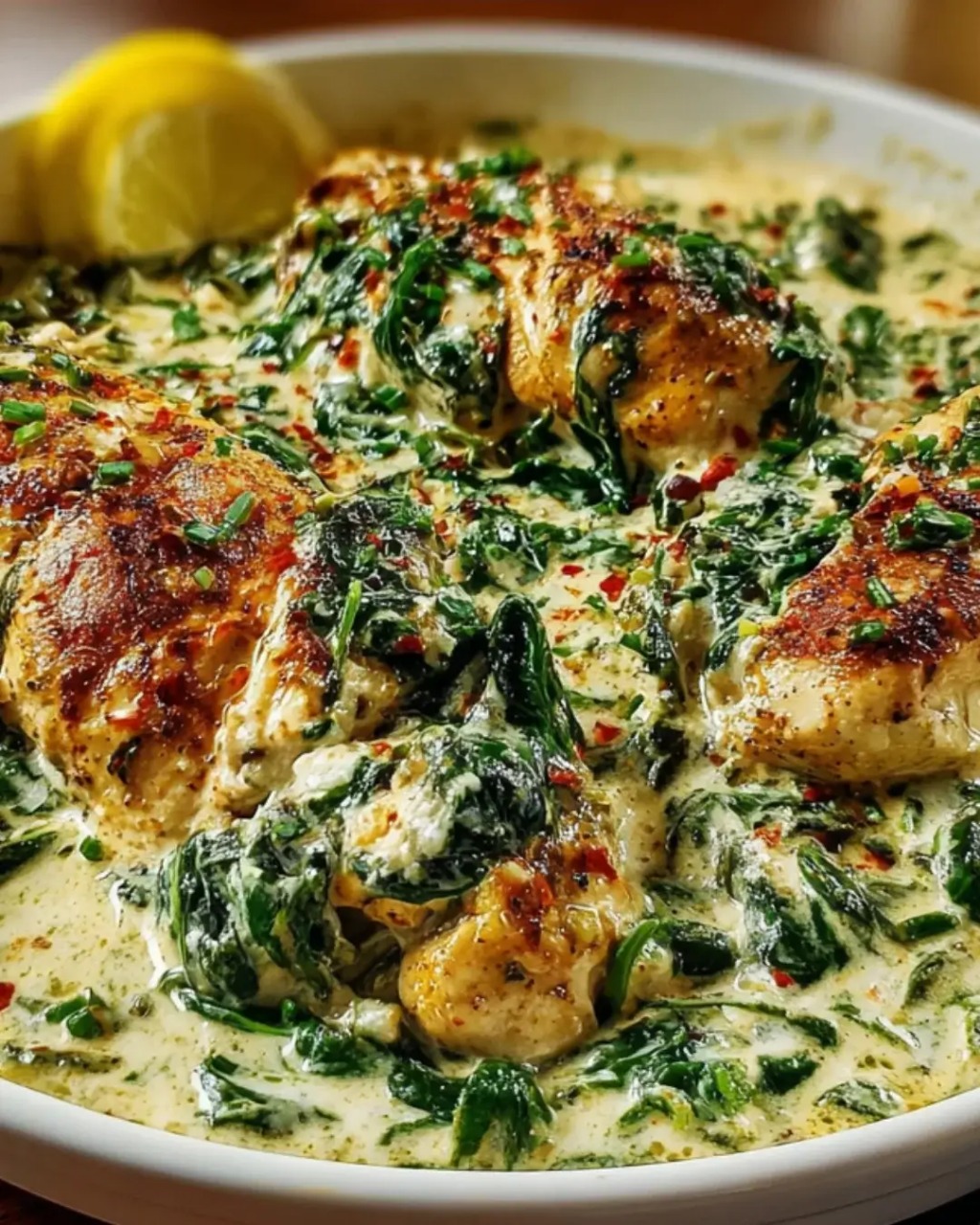 Mediterranean Creamy Spinach Chicken Skillet is a simple yet luxurious dish that delivers bold flavor with minimal effort. The combination of tender chicken, silky garlic cream sauce, and fresh spinach creates a perfectly balanced meal that feels both comforting and refined. It is ideal for weeknight dinners, special occasions, or meal prep, and it pairs beautifully with everything from pasta to fresh bread. Once you taste the bright lemon finish and rich, savory sauce, this recipe is sure to become a regular favorite at your table.