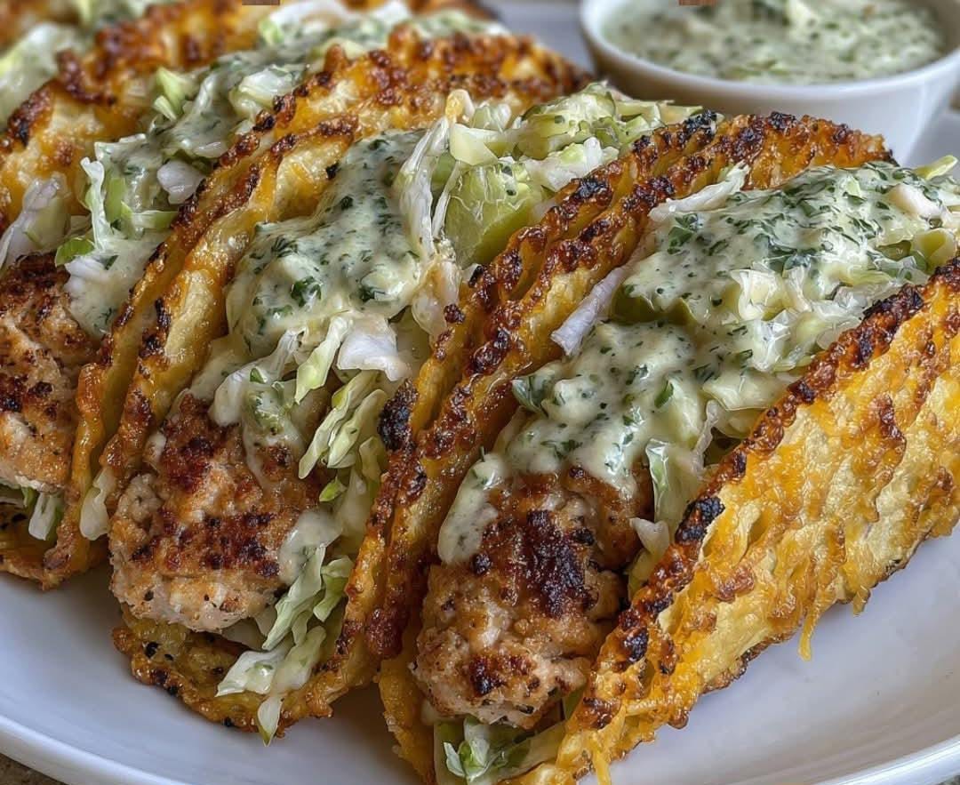 Mediterranean Dill Pickle Ranch Smash Chicken Tacos with Crispy Cheese Lace