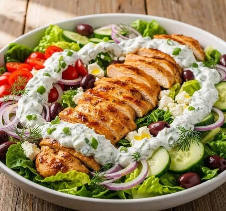 This hearty Greek-inspired salad bowl is a celebration of fresh Mediterranean flavors — crisp greens, juicy grilled chicken, sweet cherry tomatoes, cool cucumber, and tangy red onion, all brought together with a creamy homemade tzatziki sauce. Perfect for a light yet satisfying lunch or dinner, it’s packed with protein, fiber, and flavor, making it both delicious and nourishing.