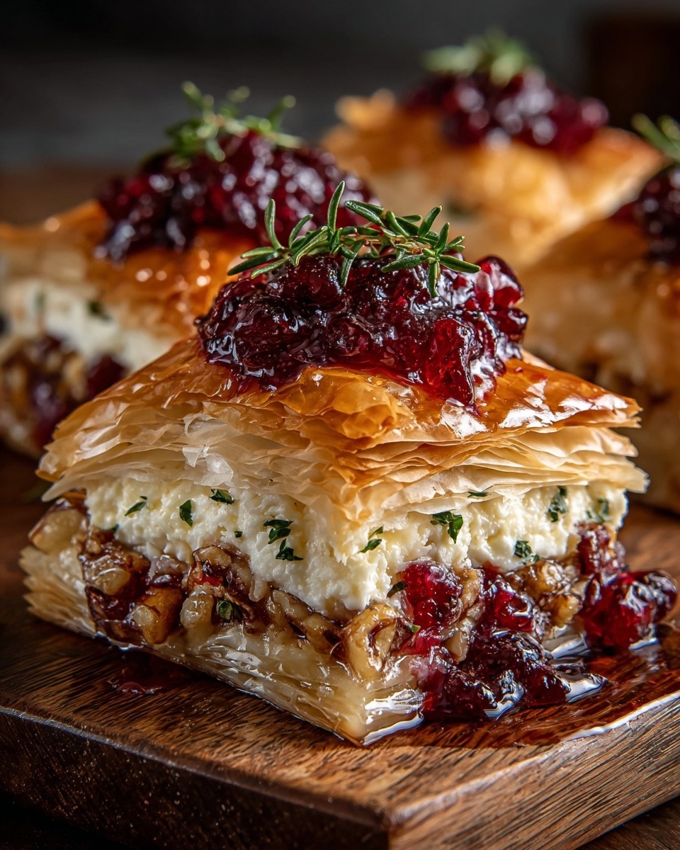 Mediterranean Festive Brie Phyllo Layers is a stunning appetizer that looks elegant yet comes together with simple ingredients. Crisp, golden phyllo pastry wraps around creamy melted brie, sweet cranberry sauce, crunchy nuts, and a light drizzle of honey for balance. Every bite delivers layers of texture, from flaky pastry to smooth cheese and nutty crunch. It is perfect for holidays, dinner parties, or any gathering where you want something impressive without spending hours in the kitchen. The flavors are rich but not heavy, making it a great starter that pairs beautifully with salads, roasted vegetables, or sparkling drinks. This dish also adapts easily to personal taste, which is why it quickly becomes a favorite for festive tables.