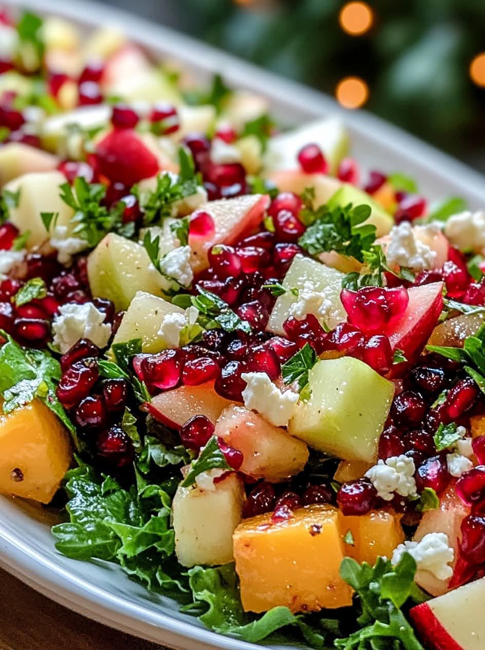This bright holiday salad brings together sweet roasted pears, tart pomegranate seeds, salty feta and crisp greens. Each bite has a mix of soft, crunchy and juicy textures, and the colors make it perfect for a Christmas table. The balsamic dressing ties everything together with a little sweetness and a gentle tang. It looks elegant but comes together quickly, and most of the prep can be done ahead. It’s a refreshing contrast to heavier holiday dishes and adds a Mediterranean touch to the menu.