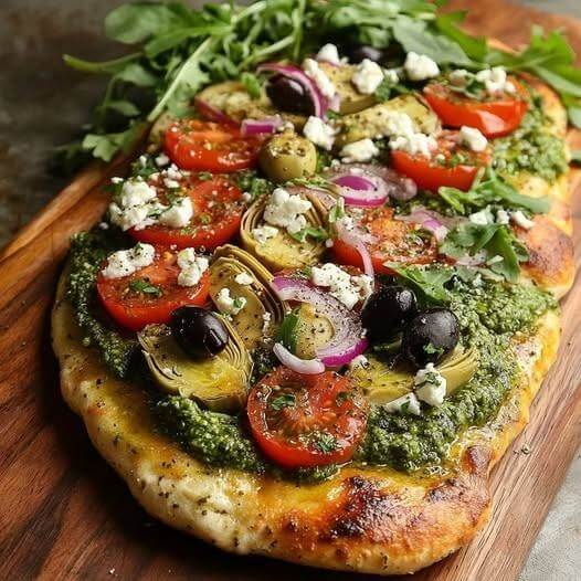 Unlike traditional thick pizza dough, flatbread creates a thin and crisp base that cooks quickly and allows the toppings to shine. The pesto sauce—often made with basil or spinach, olive oil, garlic, and nuts—adds a rich herbal flavor that complements the creamy mozzarella and tangy feta cheese. Fresh vegetables like cherry tomatoes and red onions bring brightness and texture, while olives and artichokes add the characteristic Mediterranean taste.