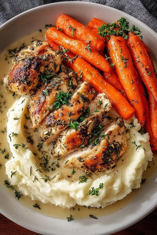 Tender garlic-herb chicken breasts served with creamy mashed potatoes and smoky, caramelized roasted carrots. A Mediterranean-inspired winter meal that is comforting, healthy, and full of flavor.