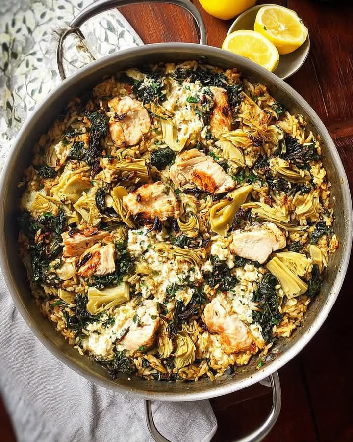 The Mediterranean Garlicky Artichoke, Spinach & Chicken Rice Skillet is a one-pan, wholesome meal that’s packed with bold flavors, lean protein, and vibrant vegetables. Tender, seasoned chicken is sautéed with garlic, spinach, and artichoke hearts, then combined with fragrant rice and Mediterranean herbs for a complete meal that’s both satisfying and simple.