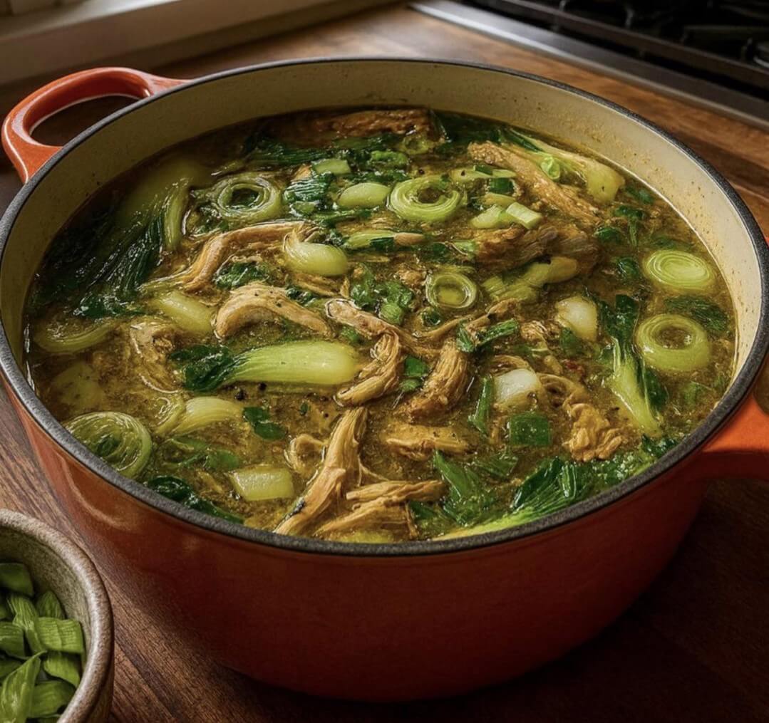 Tender chicken thighs simmer in a fragrant broth with onions, garlic, ginger, and herbs, while jasmine rice and bok choy add heartiness and a subtle crunch. Hints of sesame oil, lime, and tamari balance the dish with rich umami and citrus brightness. It’s a soothing, complete meal — perfect for chilly days, post-workout recovery, or when you just need a healthy, restorative bowl.