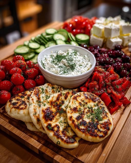 A Mediterranean Greek Appetizer Board is less about strict recipes and more about thoughtful balance. It brings together creamy, crunchy, salty, and fresh elements that invite people to gather, graze, and slow down. This version centers on cool homemade tzatziki and warm toasted flatbread, supported by classic Greek flavors like olives, feta, crisp vegetables, and simple herbs. It works just as well for casual evenings as it does for entertaining, and it scales easily depending on how many people you are serving.