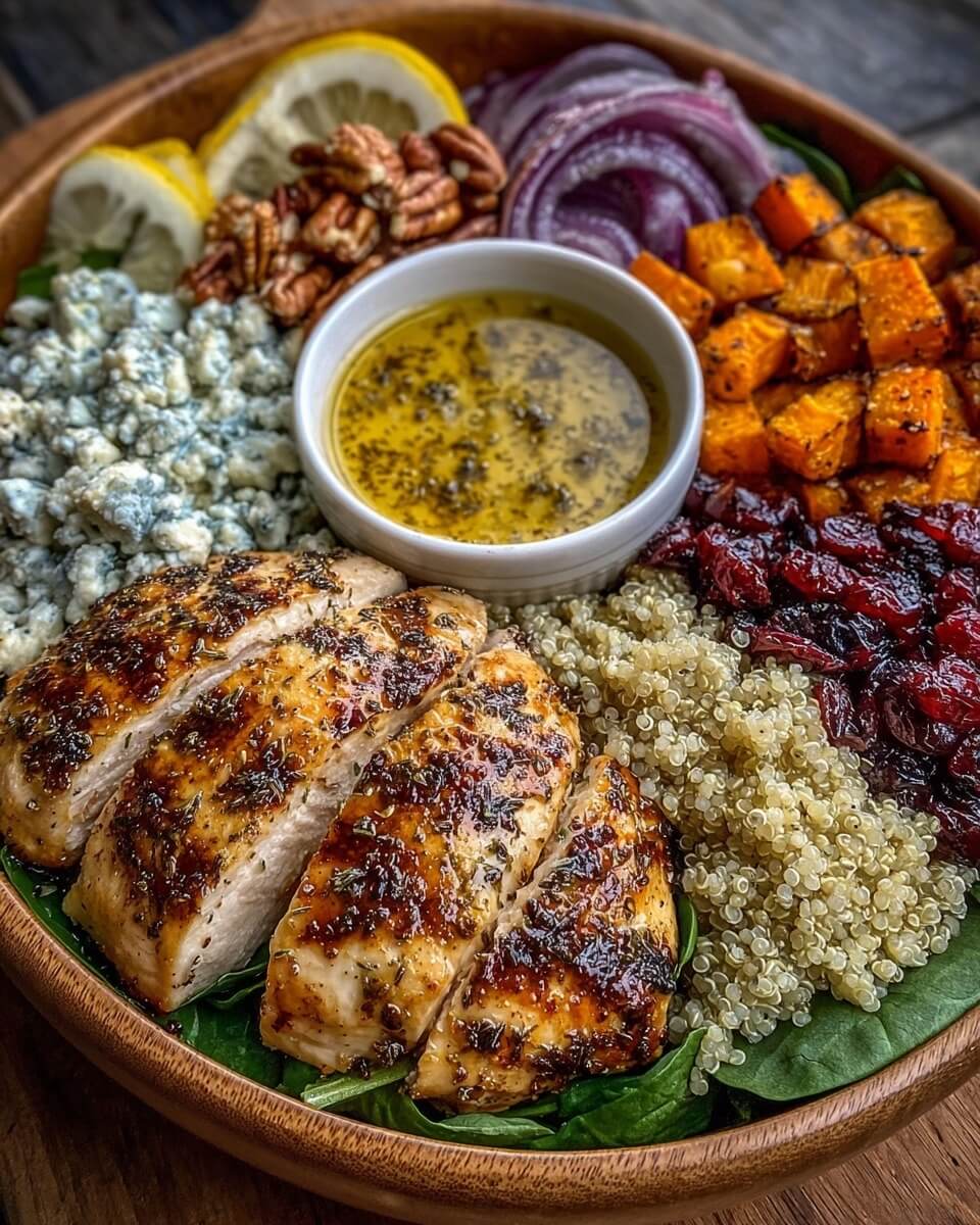 This Mediterranean Greek Chicken Harvest Bowl with Cranberries & Blue Cheese is a hearty, balanced meal that brings together sweet, savory, and tangy flavors in one vibrant bowl. Tender grilled chicken, roasted vegetables, and quinoa form the base, while dried cranberries, toasted nuts, and creamy blue cheese add texture and richness. Finished with a simple balsamic honey-Dijon dressing, it’s a satisfying mix of Mediterranean freshness and cozy fall-inspired warmth. Perfect for meal prep, lunch, or an easy weeknight dinner, this bowl is colorful, nourishing, and full of flavor.