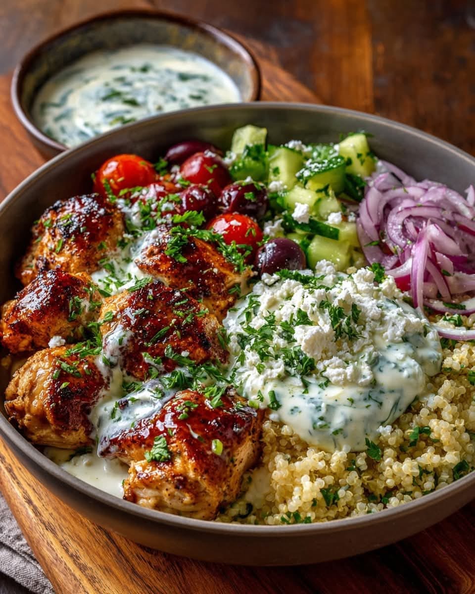 These Greek-inspired chicken souvlaki bowls are fresh, colorful, and packed with Mediterranean flavors. Juicy marinated chicken is served over a base of rice, quinoa, or couscous, then topped with crisp veggies, olives, feta, and a creamy yogurt dill sauce. It’s a wholesome and balanced meal that’s simple enough for weeknights yet impressive enough for entertaining.