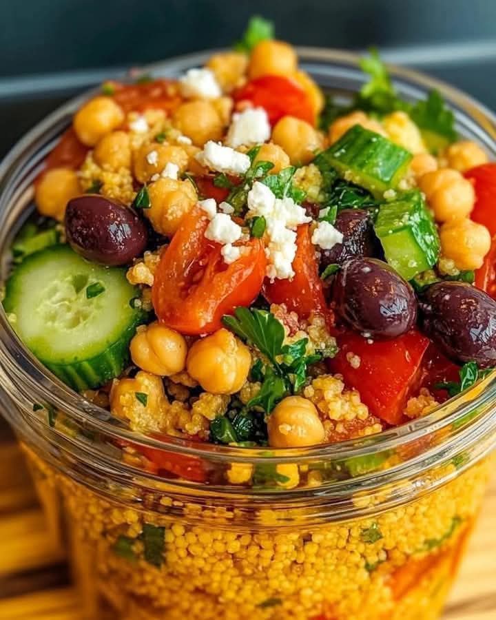 The Mediterranean Greek Couscous & Veggie Jar Salad is the perfect fusion of convenience, nutrition, and flavor. It’s easy to assemble, ideal for meal prep, and bursting with vibrant Mediterranean ingredients like olives, cucumbers, feta, and herbs—all balanced by a zesty vinaigrette and fluffy couscous.