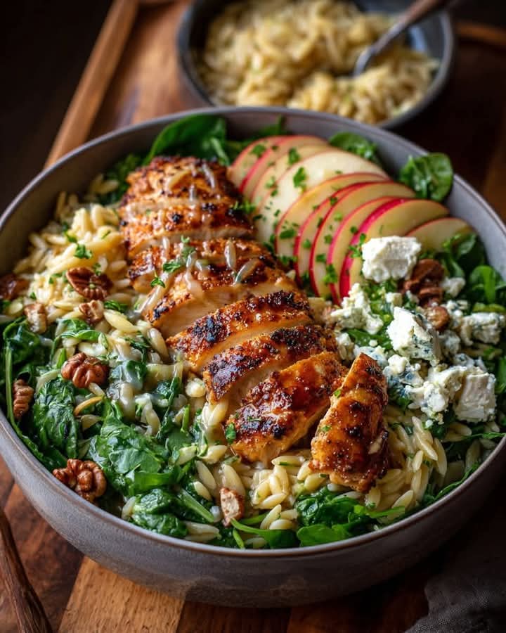 This Mediterranean-inspired bowl combines juicy grilled chicken, tender orzo pasta, baby spinach, tangy feta, crunchy pecans, and crisp apple slices — all drizzled with a creamy honey mustard or lemon vinaigrette. It’s a nourishing, texture-rich bowl that blends savory, sweet, and tangy flavors for a balanced and refreshing meal.
