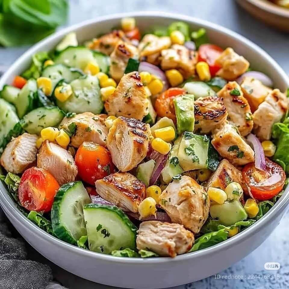 This Mediterranean grilled chicken salad is fresh, colorful, and full of flavor. Juicy grilled chicken tops a bed of crisp greens, with sweet corn, cool cucumber, ripe tomatoes, and red onion bringing brightness and crunch. A simple Mediterranean-inspired dressing ties it all together, with optional extras like feta, olives, or avocado for even more richness. It’s satisfying enough for a main meal but light enough to enjoy on a warm day.