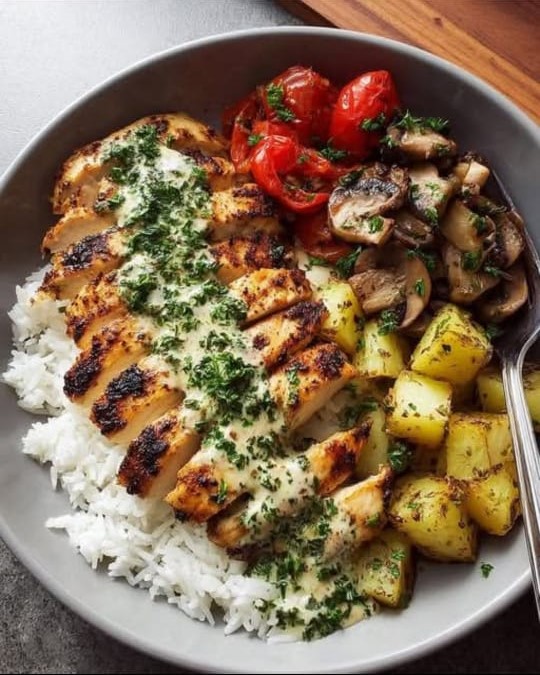 This Mediterranean Grilled Chicken & Veggie Power Bowl is a satisfying, all-in-one meal that’s full of color and balanced nutrition. Grilled chicken seasoned with herbs sits over fluffy white rice, paired with roasted baby potatoes, sautéed mushrooms, and juicy cherry tomatoes. It’s finished with a silky garlic-herb cream sauce that ties the whole dish together. Perfect for weeknight dinners or meal prep, this bowl brings comfort and freshness in every bite.