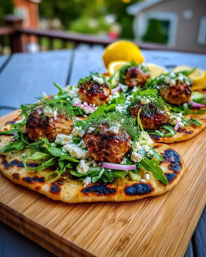 Mediterranean Grilled Flatbread with Lemony Chicken Meatballs