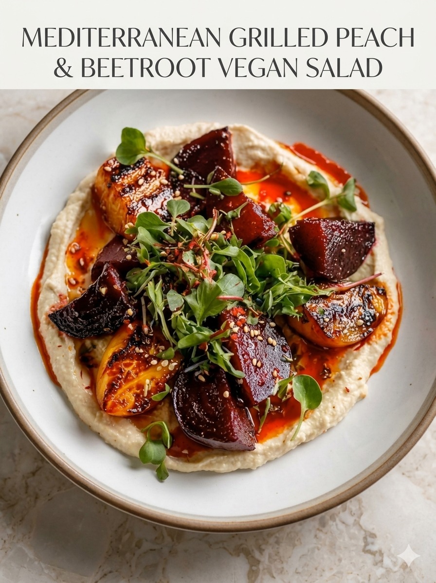 This Mediterranean Grilled Peach & Beetroot Vegan Salad is a bold mix of sweet, smoky, creamy, and tangy flavors. Roasted beetroot brings earthiness, grilled peaches add natural caramelized sweetness, and a silky hummus base ties everything together with richness and protein. Finished with a chili–sesame drizzle and fresh microgreens, this salad feels gourmet but stays completely plant-based and nourishing. It works beautifully as a light meal, a shared appetizer, or a standout side dish for gatherings.