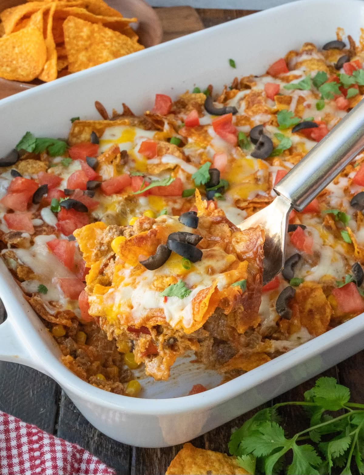 A: Doritos stay semi-crispy on the top layer but soften slightly in the bottom layers as they absorb flavor. For extra crunch, save some crushed chips to sprinkle on top halfway through baking.