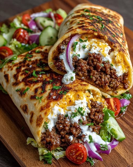 Mediterranean Ground Beef Pita Wraps with Hot Honey Feta Cream bring together savory spiced meat, cool fresh vegetables, and a creamy sauce that balances salt, sweetness, and gentle heat. The combination feels comforting yet fresh at the same time.