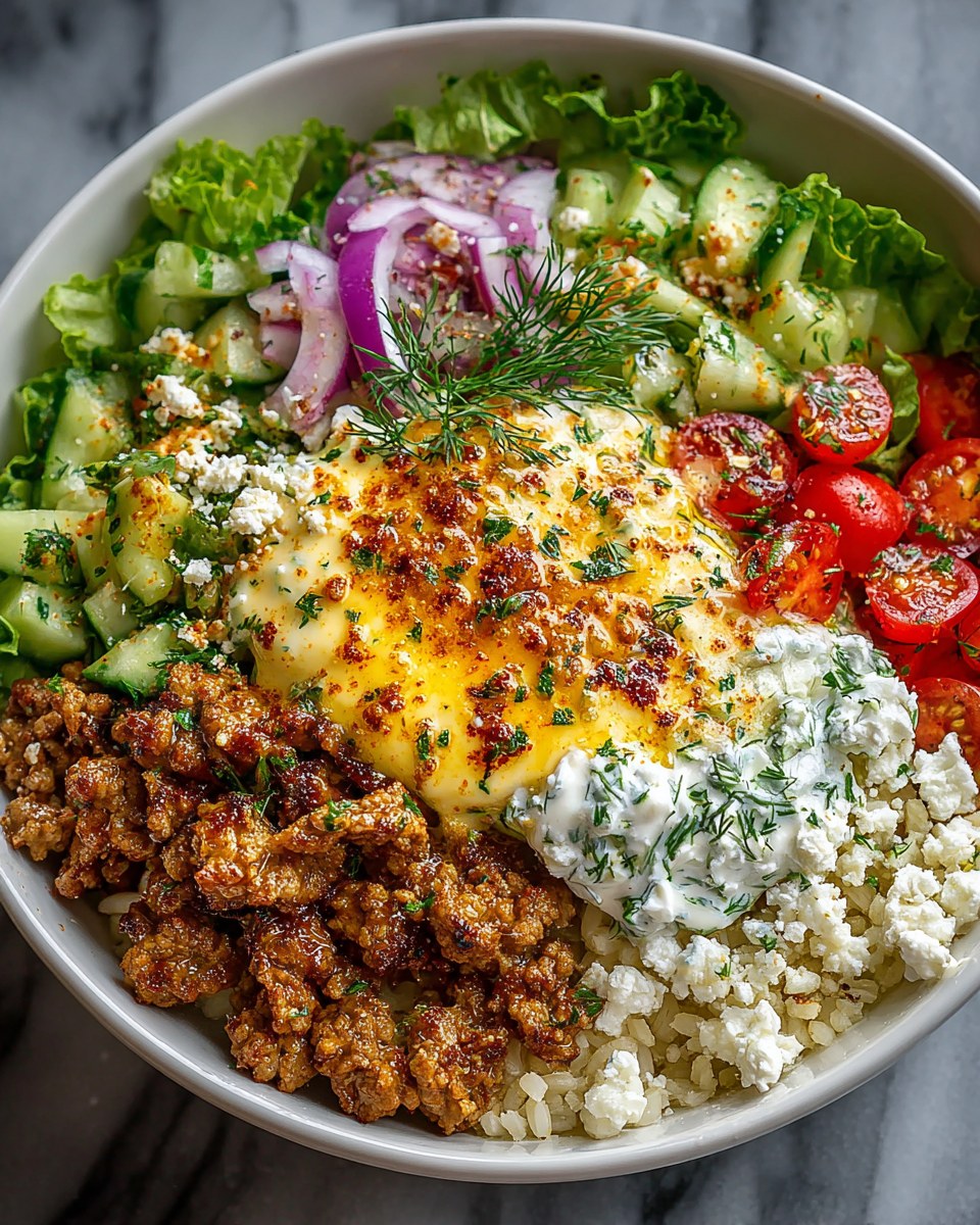Mediterranean Ground Chicken Wrap Bowl with Creamy Hot Honey Feta Sauce