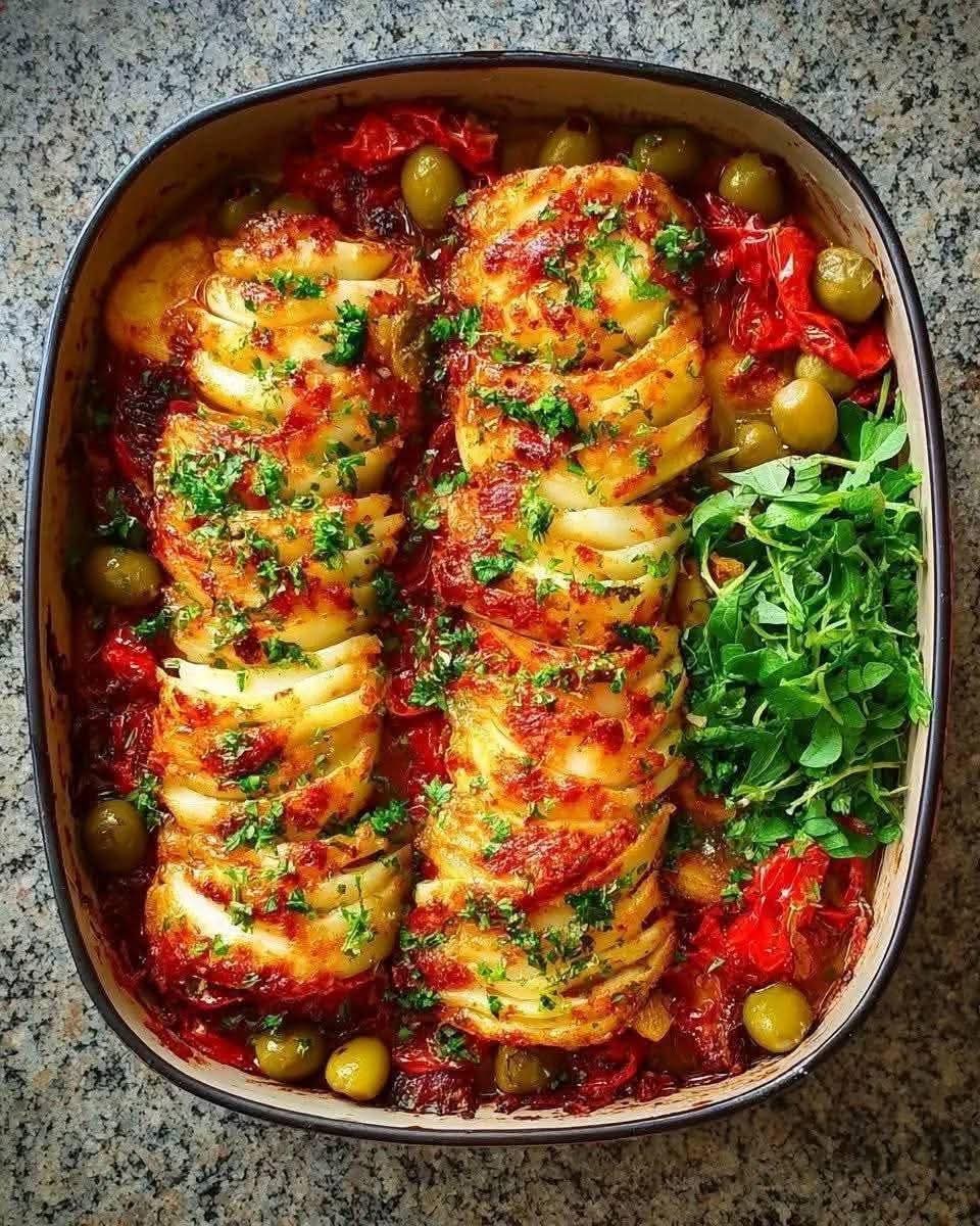 The Mediterranean Hasselback Halloumi Traybake brings together the best of the Mediterranean pantry—herb-roasted vegetables, golden cheese, and zesty lemon—into one tray of oven-roasted bliss. Whether you’re cooking for a weeknight dinner, a vegetarian crowd, or prepping for a mezze-inspired spread, this dish is a simple yet elegant centerpiece.
