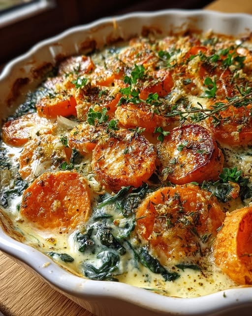 Mediterranean Healthy Sweet Potato and Spinach Casserole with Herbs and Light Cream Sauce