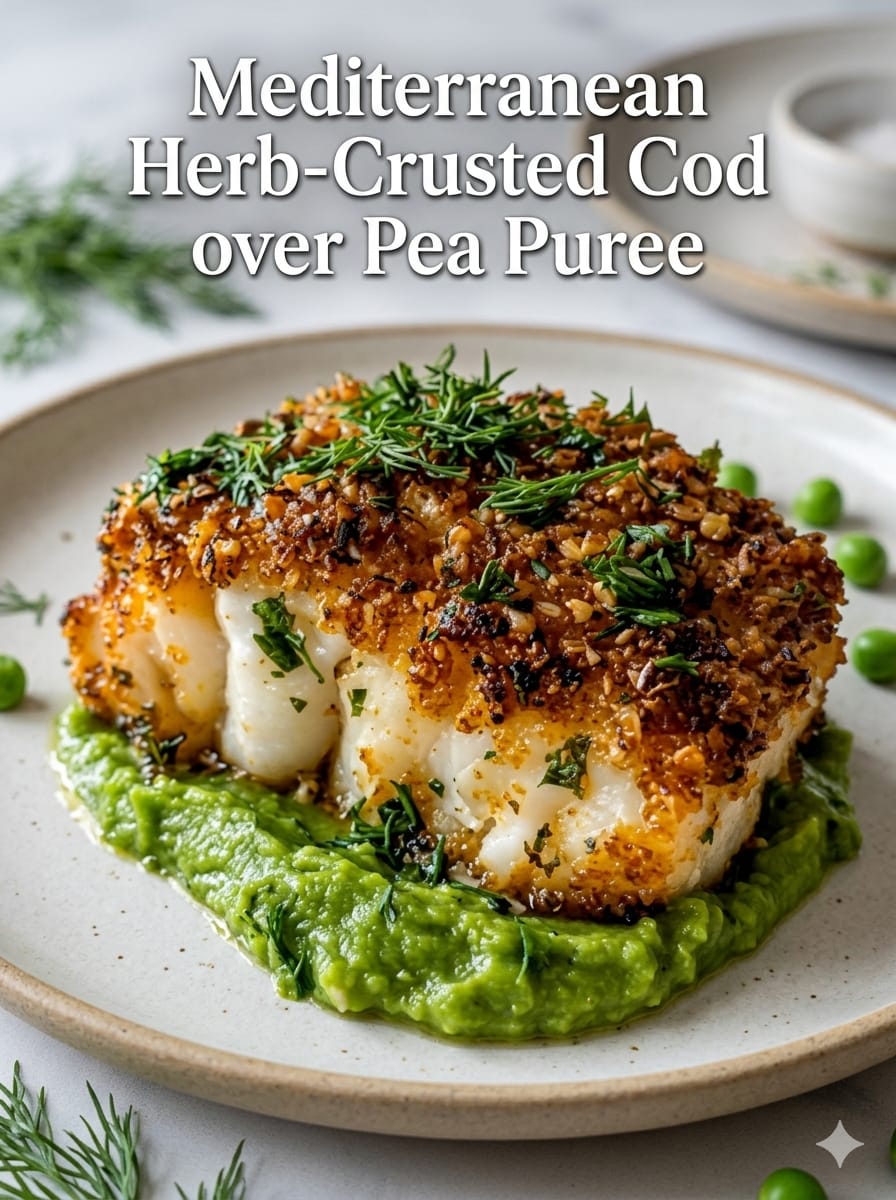 This Mediterranean herb-crusted cod is a light yet flavorful dish that feels elegant without being complicated. The cod is topped with a fragrant herb crust that turns golden and slightly crisp in the oven, while staying tender and flaky inside. It’s served over a vibrant pea purée that adds freshness, color, and a subtle sweetness that balances the savory fish perfectly. This dish is ideal for a healthy dinner, a special occasion, or when you want something restaurant-quality made right at home.