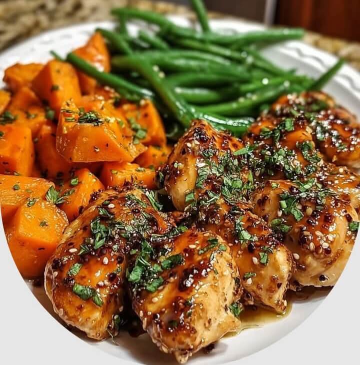 This Mediterranean Honey Garlic Chicken with Sweet Potatoes and Green Beans is a wholesome, well-balanced dish that brings together lean protein, vibrant vegetables, and a sweet-savory glaze. The chicken is pan-seared or baked with a honey garlic sauce that’s infused with Mediterranean-inspired simplicity — minimal seasoning but maximum flavor. Sweet potatoes are roasted until caramelized and slightly crisp, while green beans are tender yet crisp for that satisfying bite.