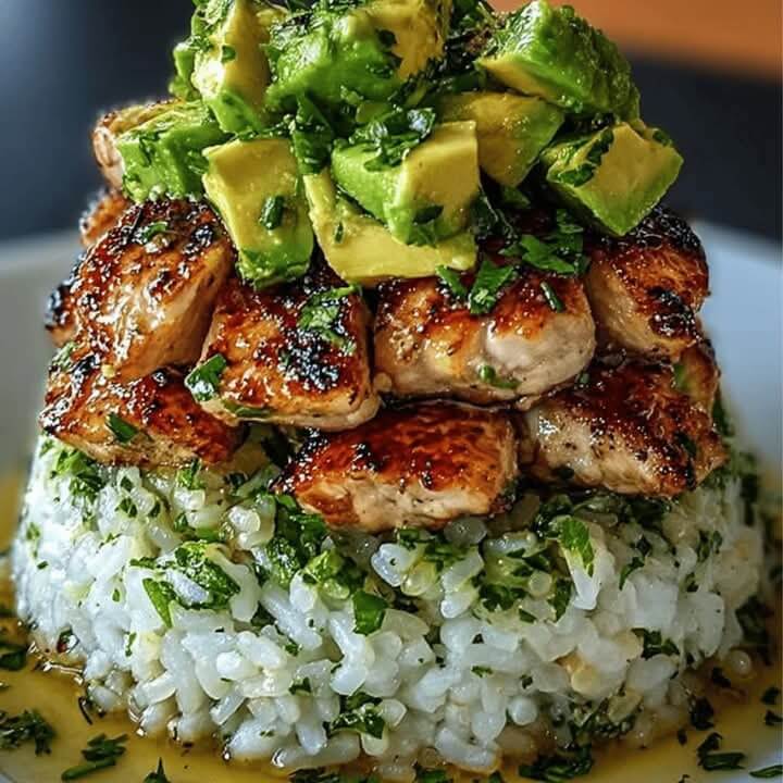 Mediterranean Honey Lemon Chicken & Avocado Rice Stack