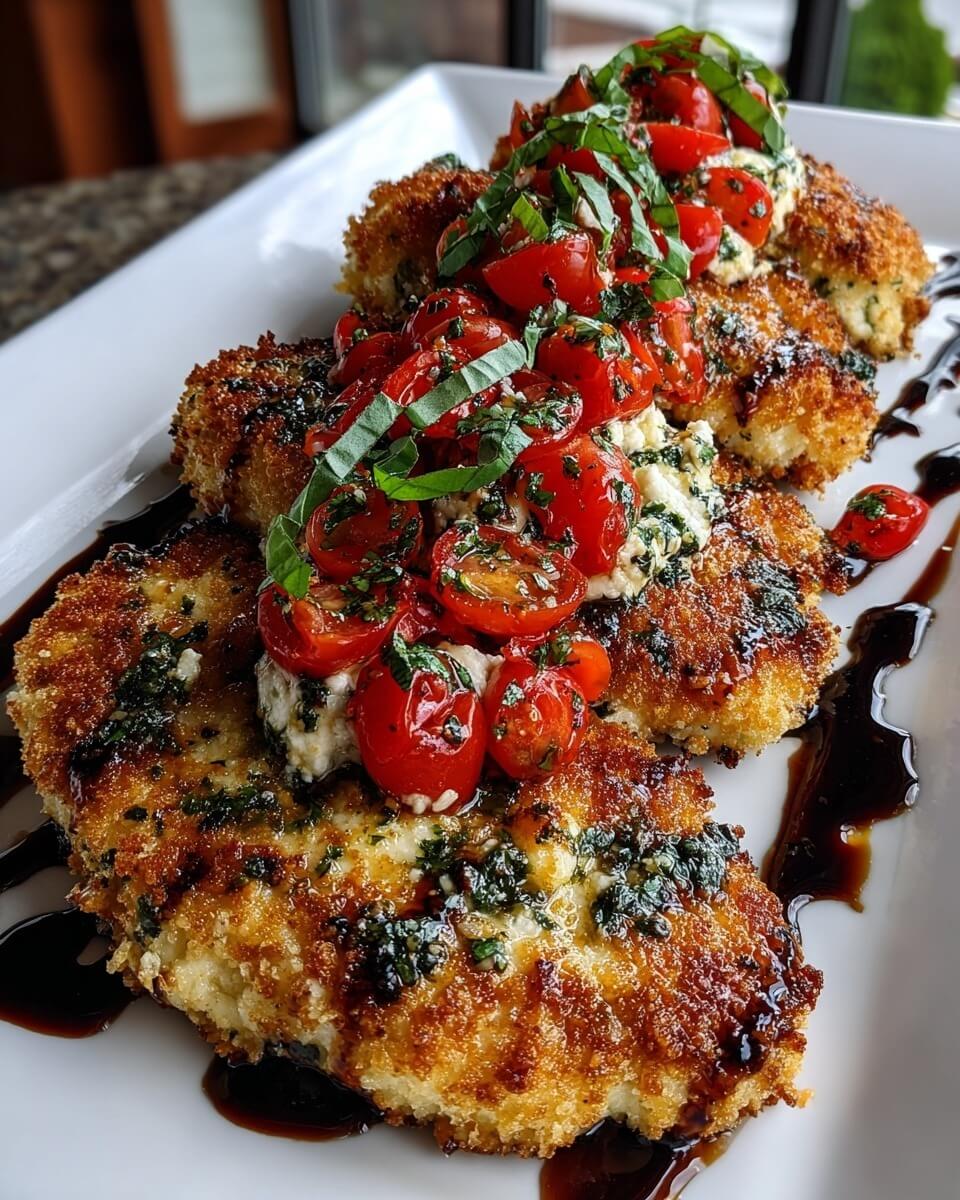This Mediterranean Italian Basil Chicken Cutlets with Tomato and Goat Cheese Topping is a bright, flavorful dish that combines the crispy crunch of golden chicken with the freshness of ripe tomatoes, creamy goat cheese, and aromatic basil. The contrast of textures and the balance between tangy, savory, and creamy flavors make it a perfect choice for a light yet satisfying dinner. Inspired by Mediterranean simplicity and Italian home-style cooking, it’s elegant enough for guests but easy enough for a weeknight meal.