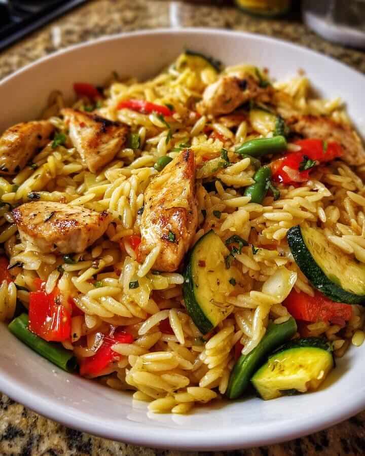This Mediterranean Lemon Chicken & Veggie Orzo Stir-Fry is a vibrant and wholesome dish that blends juicy pan-seared chicken, fresh vegetables, and tender orzo pasta—all tossed in a lemony herb sauce. It’s a one-pan wonder that delivers classic Mediterranean flavors like garlic, oregano, parsley, and olive oil, with a satisfying mix of protein, fiber, and bright citrus.