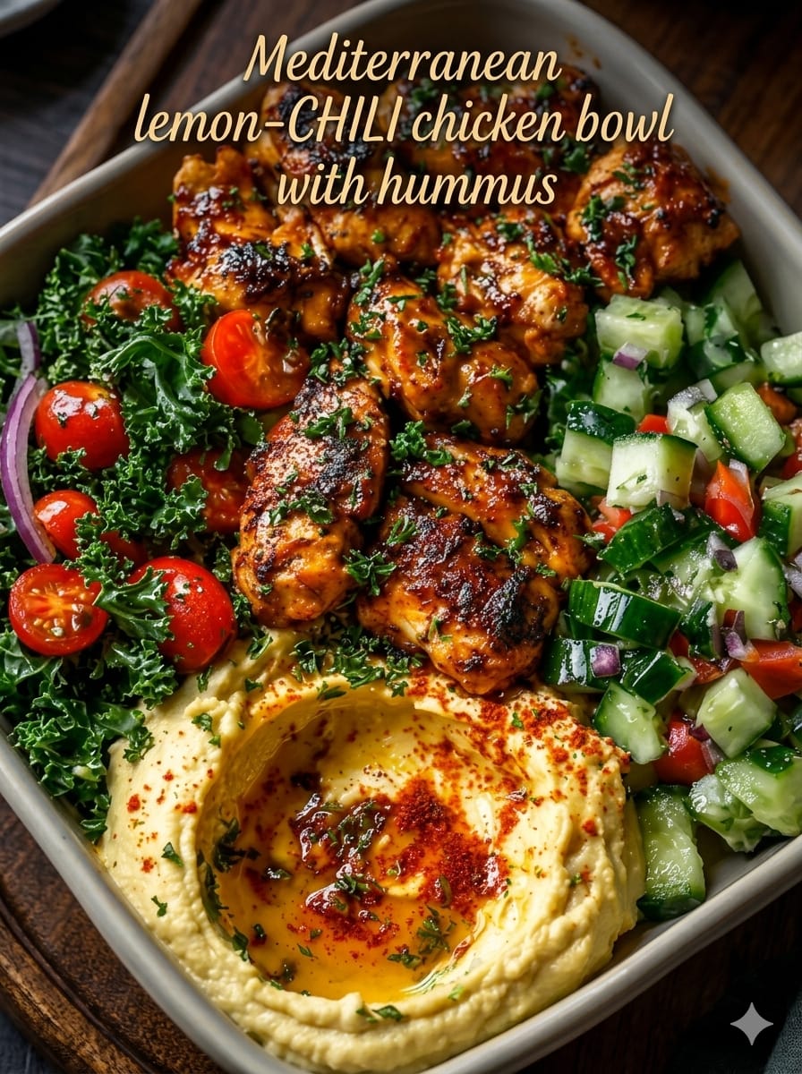 This Mediterranean lemon-chili chicken bowl is fresh, vibrant, and packed with bold flavors that feel both nourishing and satisfying. Juicy marinated chicken is paired with a crisp cucumber-tomato salad, creamy hummus, and a base of grains or greens for a complete, balanced meal. The bright citrus, gentle heat from chili flakes, and aromatic herbs create a dish that feels light yet filling. It’s perfect for meal prep, quick lunches, or a wholesome dinner that doesn’t compromise on taste.