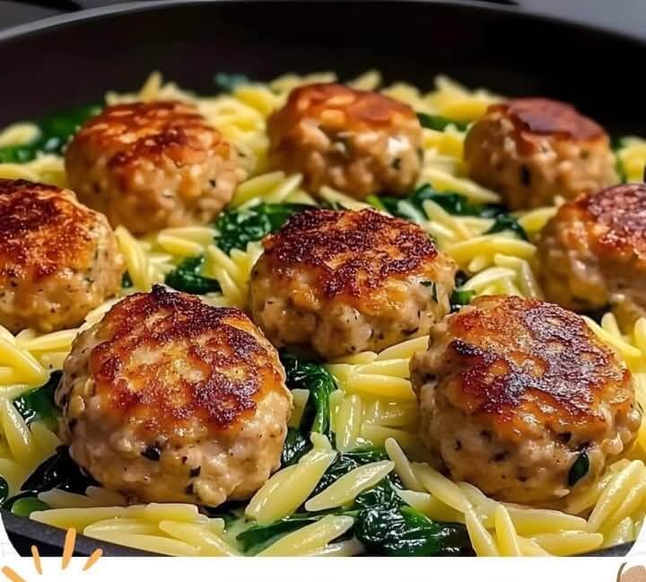 This dish is bright, creamy, and comforting all at once. Juicy chicken meatballs enriched with ricotta and Parmesan are infused with lemon and Mediterranean spices, then served over tender orzo tossed with garlicky spinach. It’s a balanced plate that feels both fresh and hearty, perfect for a weeknight dinner or a relaxed weekend meal.