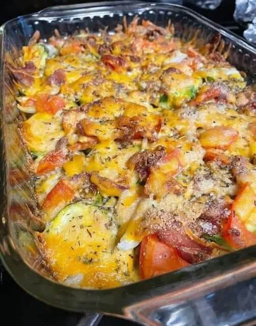 A hearty Mediterranean-style casserole featuring sautéed vegetables, seasoned ground beef, tangy feta, and juicy tomatoes—perfect for low-carb comfort food lovers.