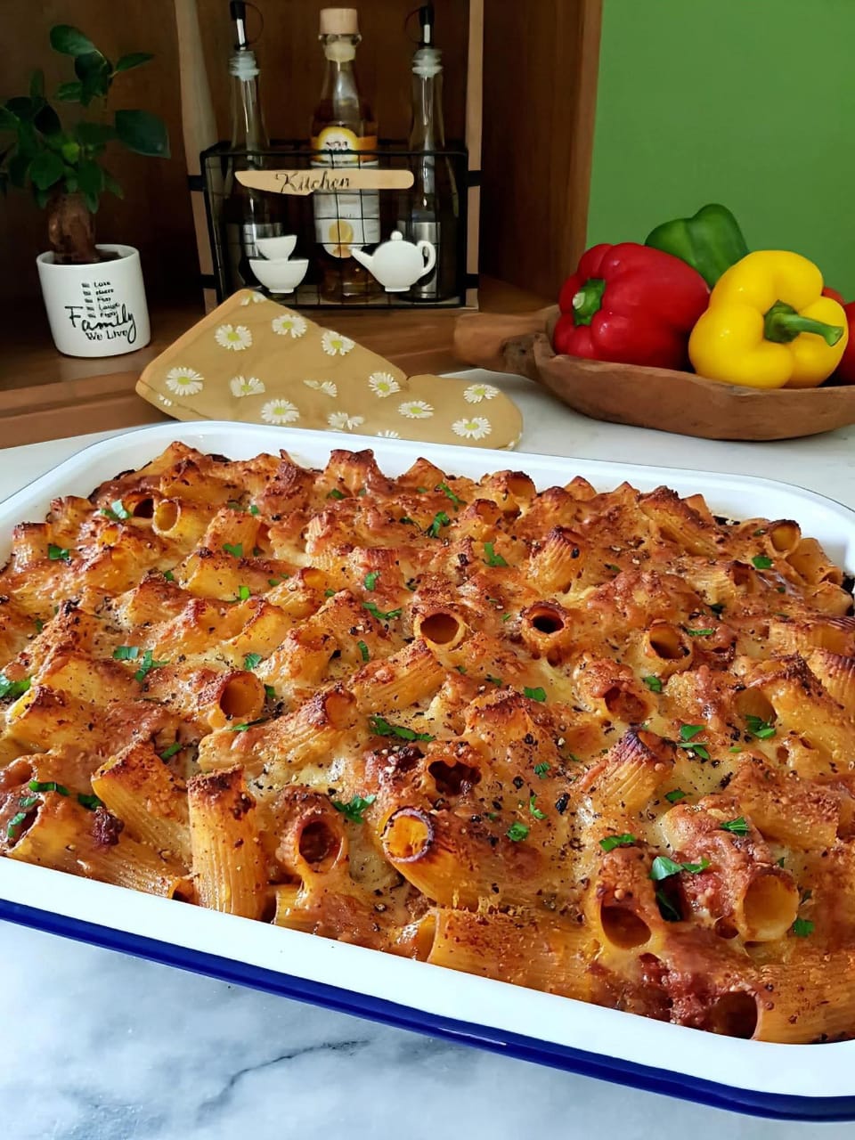 Let the baked macaroni rest for 10–15 minutes before slicing. Garnish with chopped parsley and serve warm.
