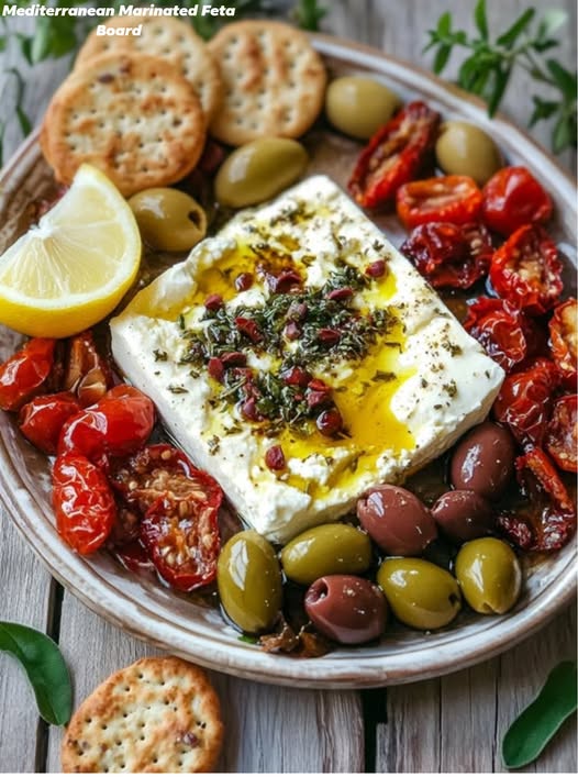 A rich, savory, Mediterranean-inspired appetizer featuring creamy feta marinated in fragrant olive oil, herbs, and briny olives — surrounded by colorful toppings like sun-dried tomatoes, mixed olives, and crisp crackers. Simple, stunning, and bursting with flavor.