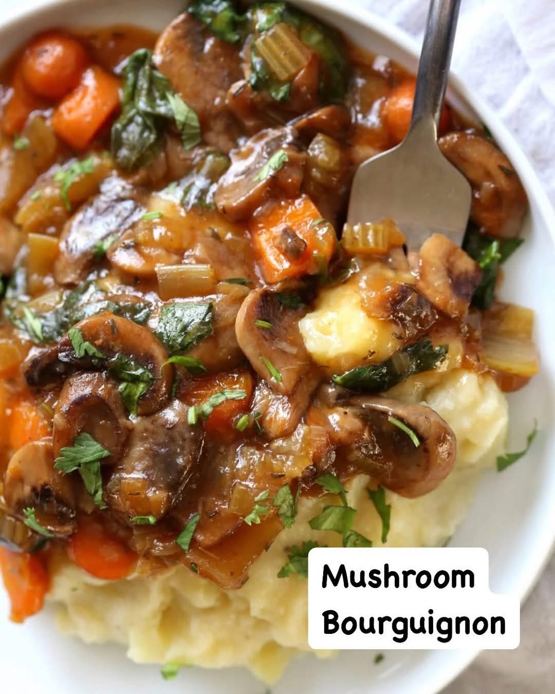 This Mediterranean Mushroom Bourguignon is a rich, earthy vegetarian twist on the classic French stew. Meaty mushrooms simmer slowly in a red wine and tomato-based sauce with garlic, thyme, and sweet carrots for depth. The flavors are bold, comforting, and beautifully balanced with creamy mashed potatoes or a light potato-cauliflower mash. It’s a cozy, elegant dish that’s simple enough for a weeknight but special enough for guests.