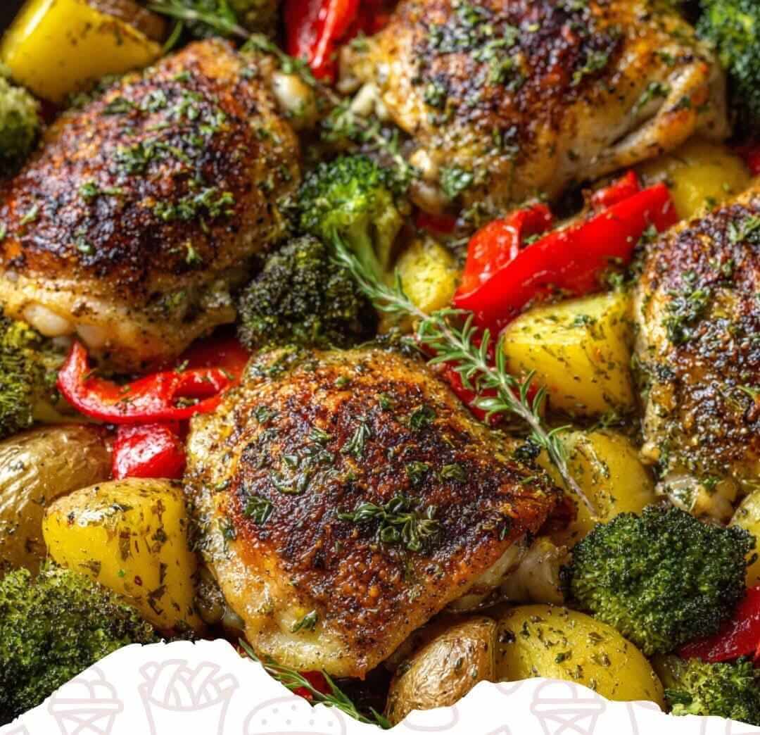 This Mediterranean One-Pan Garlic Herb Roasted Chicken Thighs with Potatoes, Broccoli, and Peppers is a meal that checks every box — colorful, nutritious, and bursting with bright, balanced flavor. The chicken comes out juicy with perfectly crisp skin, while the potatoes, peppers, and broccoli soak up all those garlic-herb juices. It’s simple enough for a busy weeknight and impressive enough for guests — all with just one pan to clean.