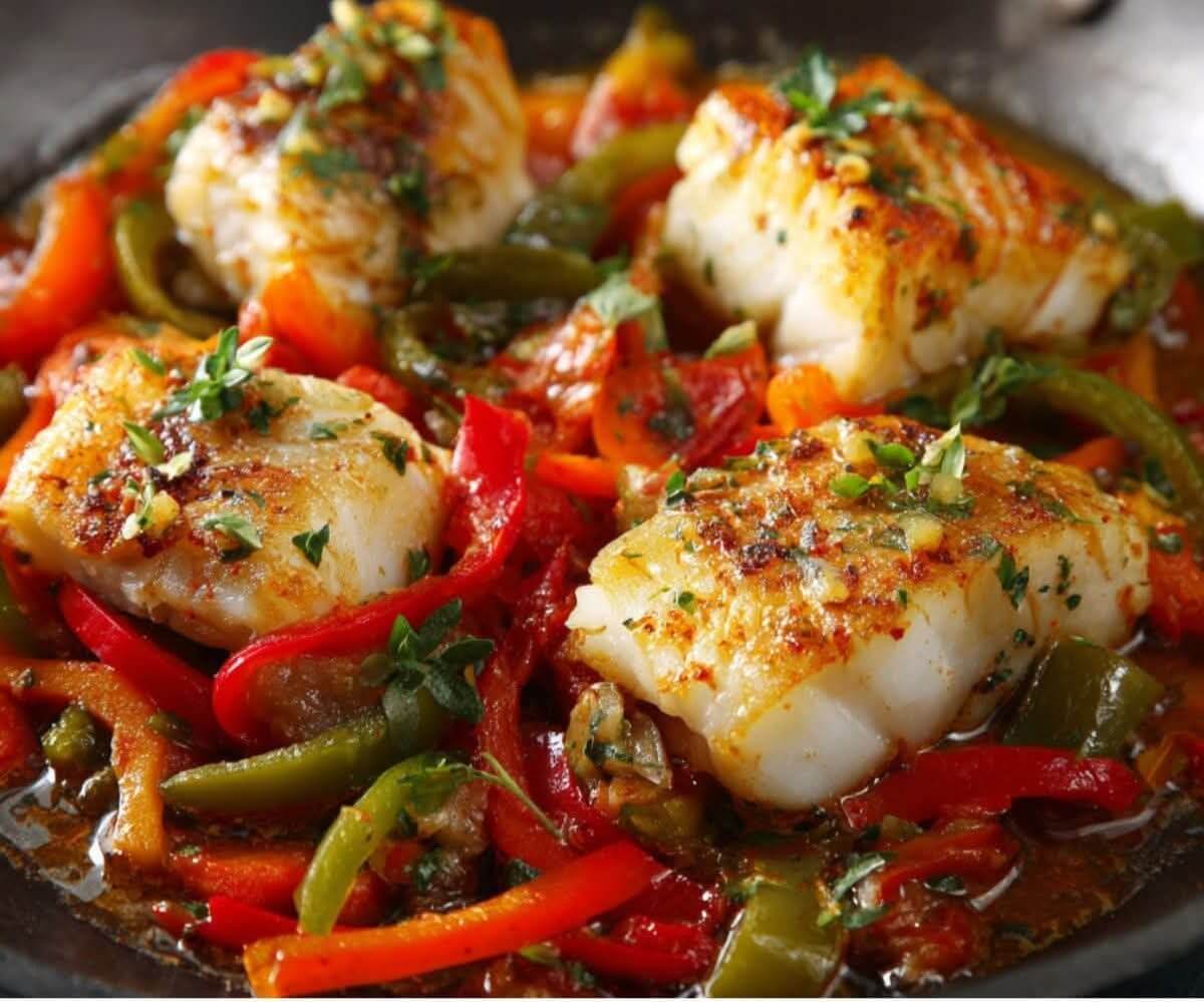 This Mediterranean-style pan-seared cod is light, flavorful, and full of vibrant colors. The tender, flaky fish is paired with a rustic tomato and bell pepper sauce infused with garlic, white wine, and fresh basil. A touch of lemon brightens the dish, while olive oil ties everything together with that signature Mediterranean richness. It’s simple enough for a weeknight yet elegant enough for a special meal — delicious served with couscous, rice, or crusty bread to soak up the sauce.