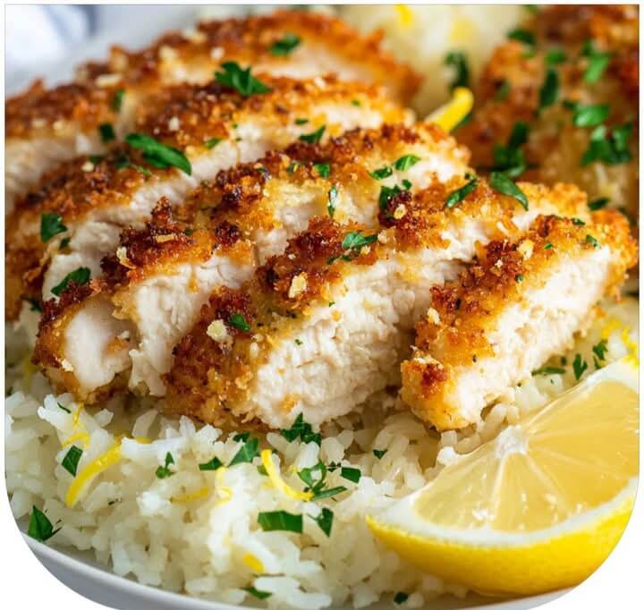 This Mediterranean-inspired dish combines the crisp, savory flavors of Parmesan-crusted chicken with fragrant lemon garlic rice. The chicken boasts a crunchy golden crust with herby notes, while the rice is light, zesty, and infused with garlic and fresh herbs. It’s a wholesome, satisfying meal that’s easy enough for a weeknight and elegant enough for guests.