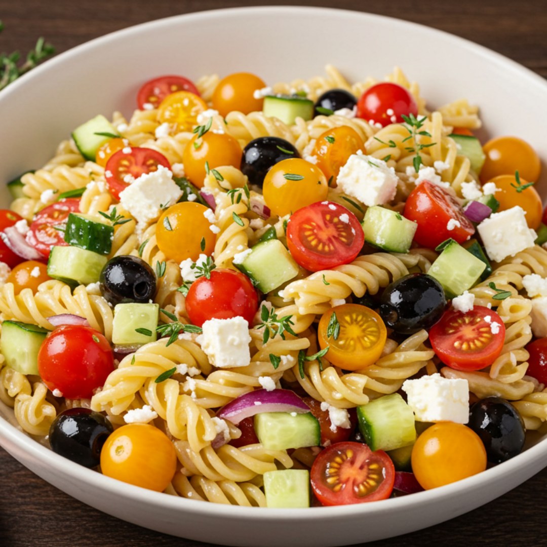 Enjoy your Mediterranean Pasta Salad with Feta and Olives! It’s packed with fresh flavors and great for any occasion.