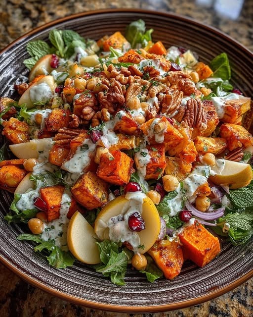 Mediterranean Pear, Sweet Potato, Apple, Chickpea and Cranberry Christmas Salad is a festive, colorful dish designed for holiday tables but simple enough to enjoy all winter. It brings together roasted sweet potatoes, crisp apples, juicy pears, and protein-rich chickpeas, balanced with tart dried cranberries and fresh herbs. The flavors are warm, bright, and gently sweet, with roasted vegetables providing depth and fruit adding freshness. A cool mint yogurt dressing ties everything together, offering creaminess without heaviness. This salad works beautifully as a vegetarian main, a holiday side, or a refreshing contrast to richer Christmas dishes. It reflects Mediterranean cooking at its best: seasonal ingredients, balance, and natural flavors layered with care.