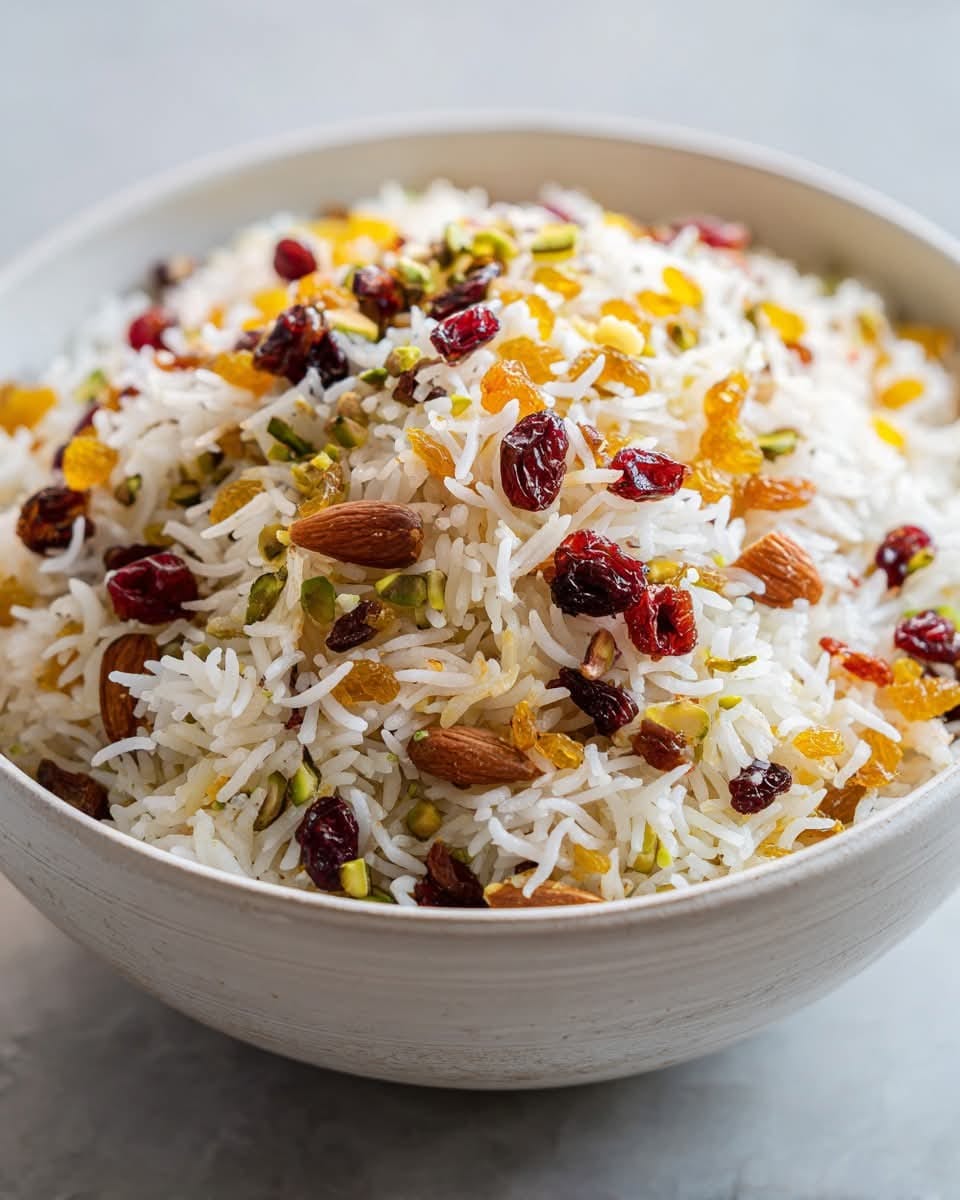 Persian jeweled rice is known for its bright colors, delicate aroma, and a blend of sweet, savory, and nutty flavors. This Mediterranean-style version stays true to the spirit of the classic dish while keeping the steps simple enough for any home kitchen. Long-grain basmati rice cooks until fluffy, and the jeweled topping brings together nuts, dried fruit, saffron, warm spices, and citrus notes. It’s the kind of dish that looks festive on the table and pairs beautifully with chicken, lamb, or roasted vegetables.