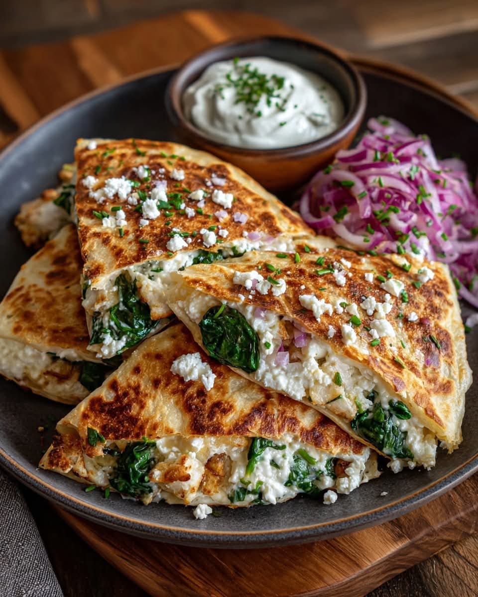 Mediterranean Quesadillas with Spinach, Feta, Mozzarella, and Red Onion