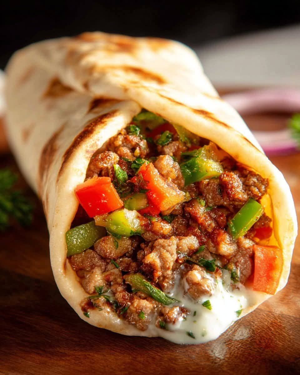 If you’re craving the flavors of shawarma but want something you can throw together in under 30 minutes, this beef wrap is your answer. Ground beef is cooked with warm spices, peppers, and onions, then wrapped in soft flatbread with a tangy garlic yogurt sauce. It’s fresh, filling, and perfect for lunch or a quick weeknight dinner.
