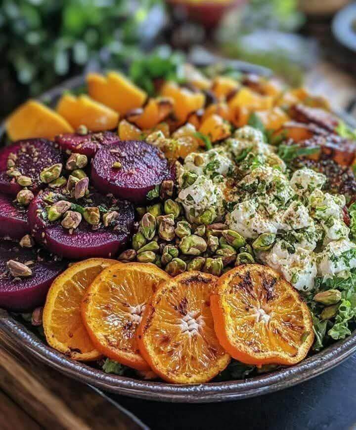 This salad is a celebration of texture and bold flavors: sweet roasted beets, juicy citrus slices, herby cottage cheese, and crunchy pistachios. The ingredients are simple, but when combined, they deliver a refreshing and deeply satisfying Mediterranean experience. It’s not just a salad—it’s a showstopper.