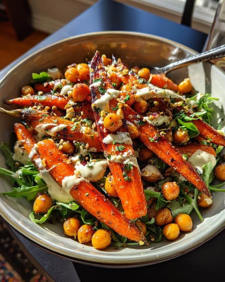 This vibrant salad blends sweet roasted carrots, hearty chickpeas, peppery greens, and a creamy, nutty tahini dressing. It’s loaded with Mediterranean-inspired spices and textures, making it perfect as a light lunch, side dish, or even a satisfying vegetarian dinner. The roasted vegetables bring warmth, while the dressing ties everything together with a tangy-sweet finish.