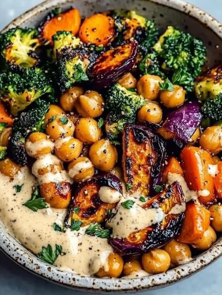 This recipe is a Mediterranean-inspired plant-based power bowl packed with roasted chickpeas, caramelized carrots, charred broccoli, and tender eggplant or sweet potatoes, all bathed in a luscious lemon-garlic tahini sauce. It’s hearty, naturally gluten-free, vegan, and brimming with flavor and texture.