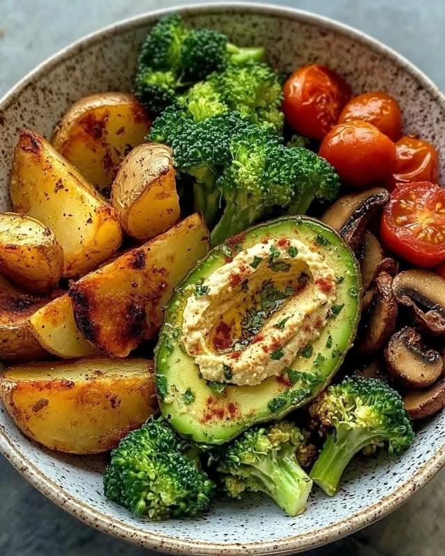 This Mediterranean Roasted Potato Veggie Bowl with Hummus-Stuffed Avocado is a flavorful celebration of textures and colors—crispy, creamy, fresh, and savory. With the earthy richness of mushrooms and broccoli added to the mix, each bite is nourishing and satisfying. Whether you’re serving it as a meatless main or a colorful side, this bowl brings wholesome Mediterranean flair to your table with ease.