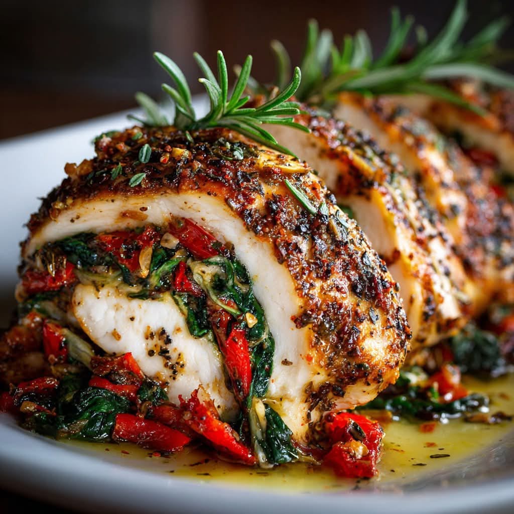 This dish combines tender chicken breasts with a savory filling of roasted red peppers, wilted spinach, and gooey mozzarella cheese. Each bite delivers a perfect balance of smoky, creamy, and herbaceous Mediterranean flavors. It’s a protein-rich, low-carb meal that feels gourmet but is simple enough for weeknights.