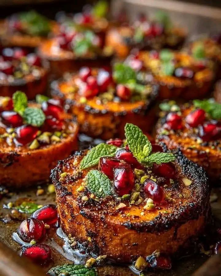 Mediterranean Roasted Sweet Potato Rounds with Honey & Pomegranate Seeds